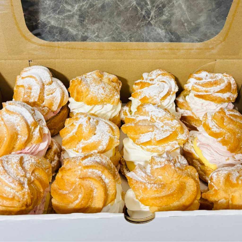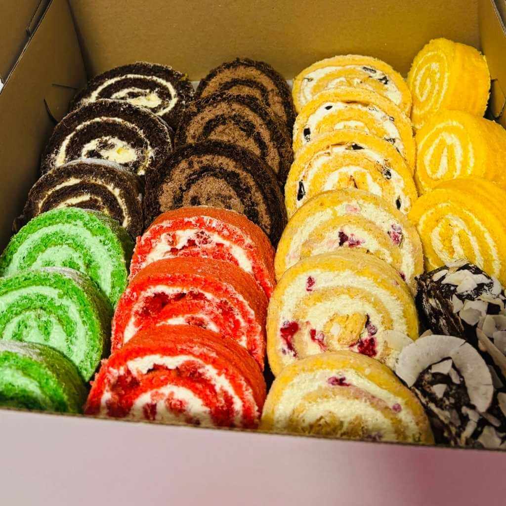 A box 23db tekercs süteményszeletet tartalmaz, vegyes ízekben.