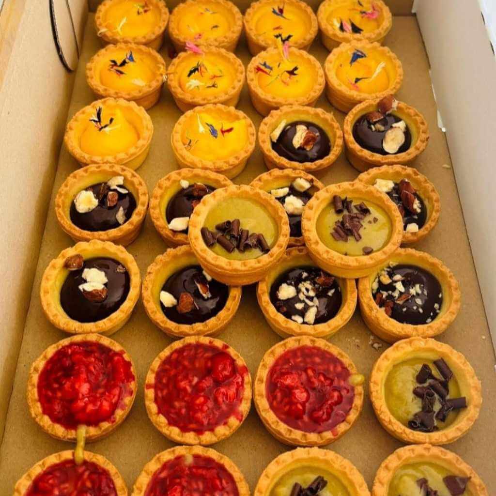 A box 30db mini tart kosarat tartalmaz. Belga csoki, lemon curd, pisztácia, pisztácia-málna, citrom-málna, karamell-csoki választható ízekben.